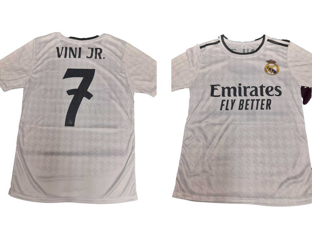## Klubový dres (Real Madrid) **Domácí bílý dres:** - Tradiční **čistě bílá barva** - Zlaté detaily a loga - Číslo **7** na zádech Jméno "VINICIUS JR." nad číslem - Logo Realu Madrid na hrudi (vlevo) - Hlavní sponzor **Emirates** uprostřed -  Límec obvykle kulatý nebo ve tvaru V - Moderní technologie odvodu potu